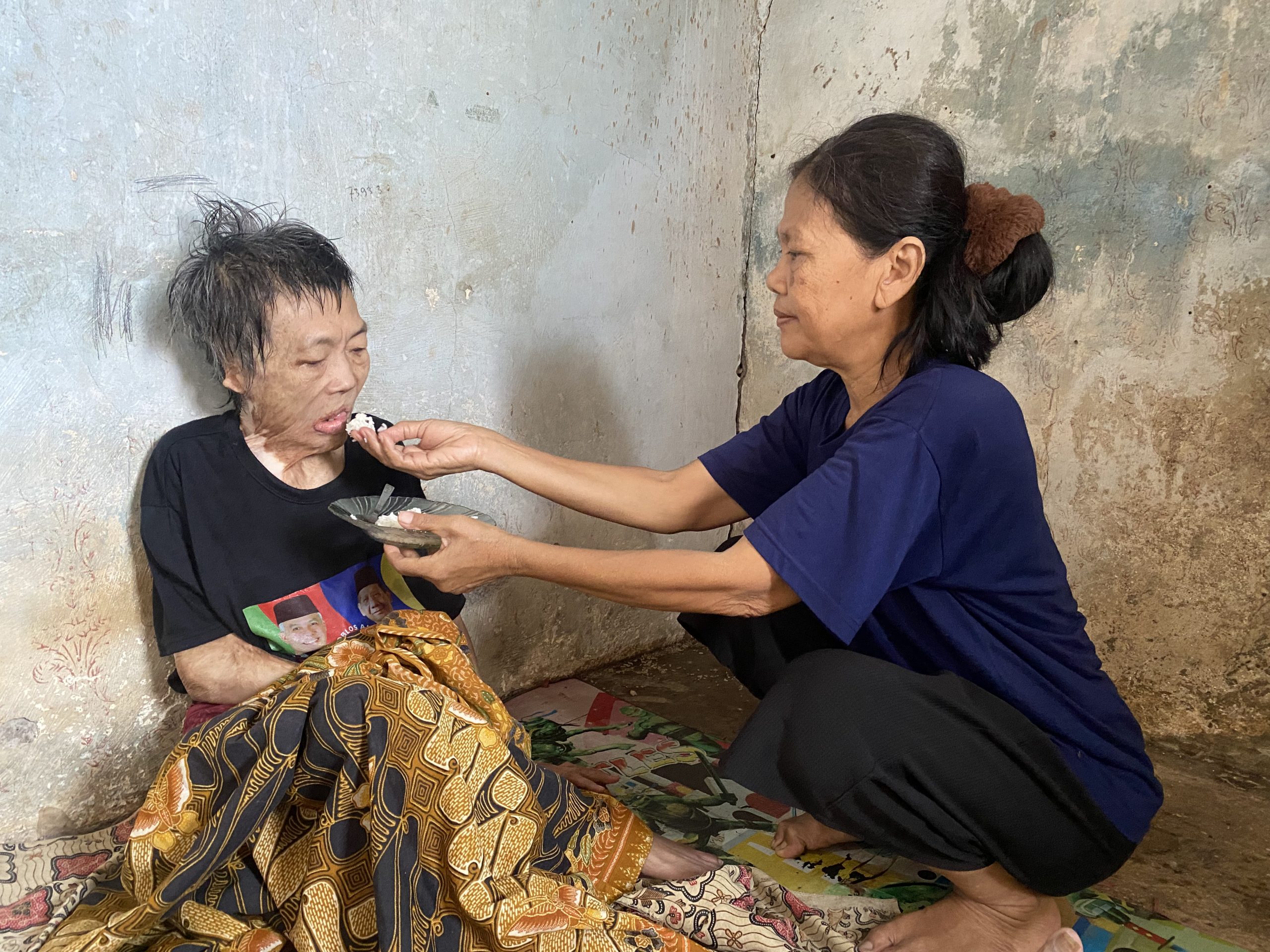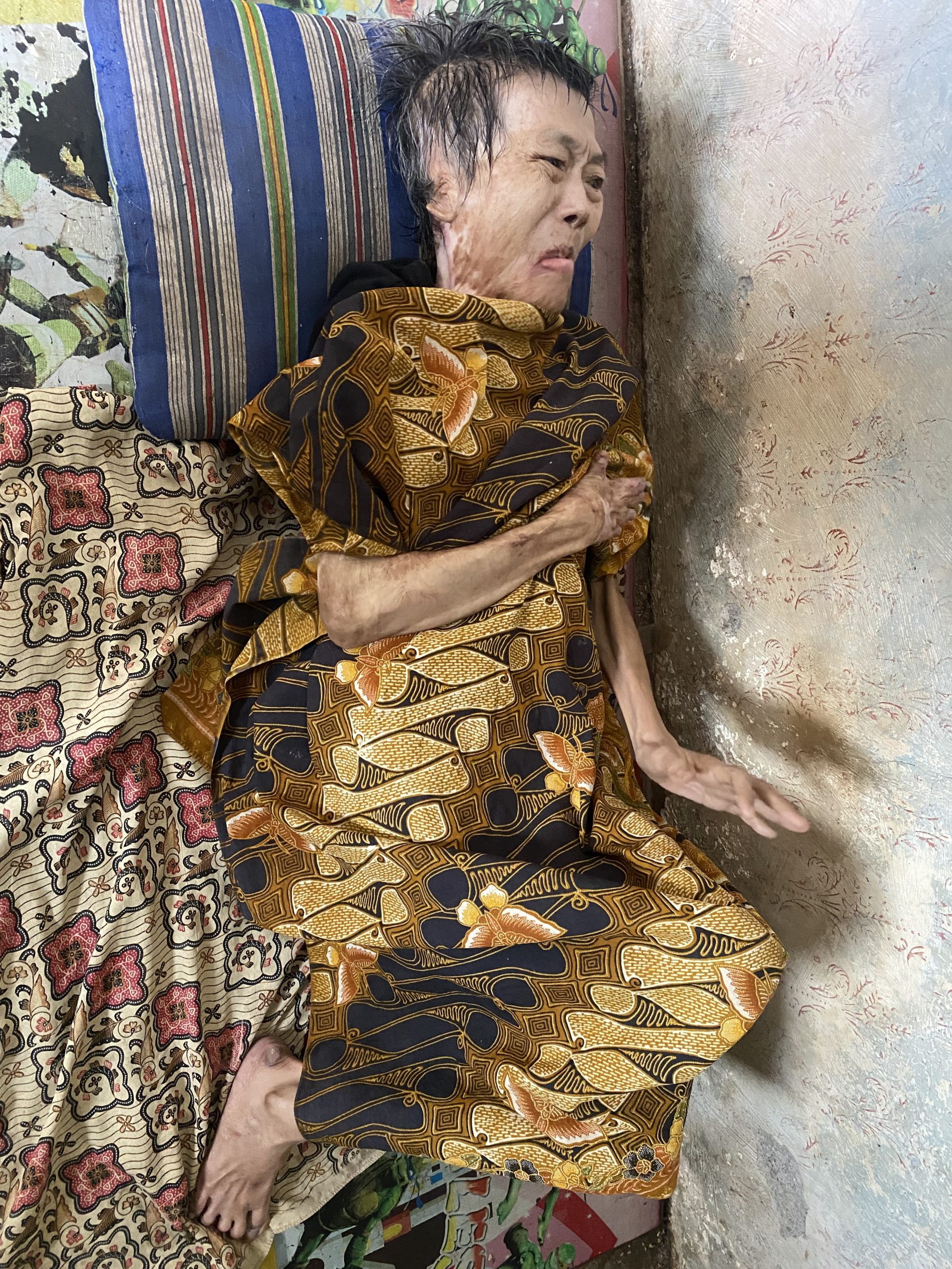 Saat tim Bantu Teman Indonesia datang ke lokasi, kami menyaksikan Mak Acih Sumiati (67) terbaring lemah di rumah kecilnya. Jeritan kesakitan masih sering terdengar. Puluhan tahun lalu, Mak gak sengaja tersiram air mendidih saat sedang memasak karna penyakit ayan nya kambuh. Sejak hari itu, rasa sakit tak pernah benar-benar pergi.